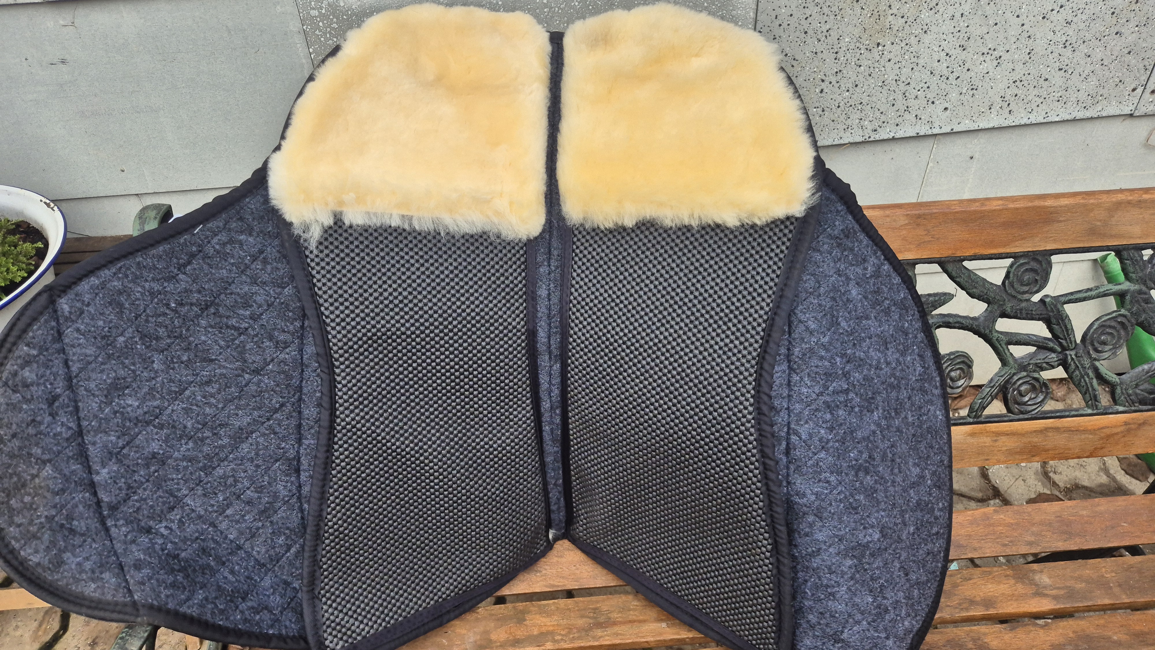 Das Oberteil ist eine formstabile Auflage aus Baumwollstepp mit Filzunterseite, innen Vliespolsterung und Sympanovapolsterung oben (hält den Sattel am Platz auf der Unterlage und absorbiert zusätzlich Druck, lässt Luft durch)